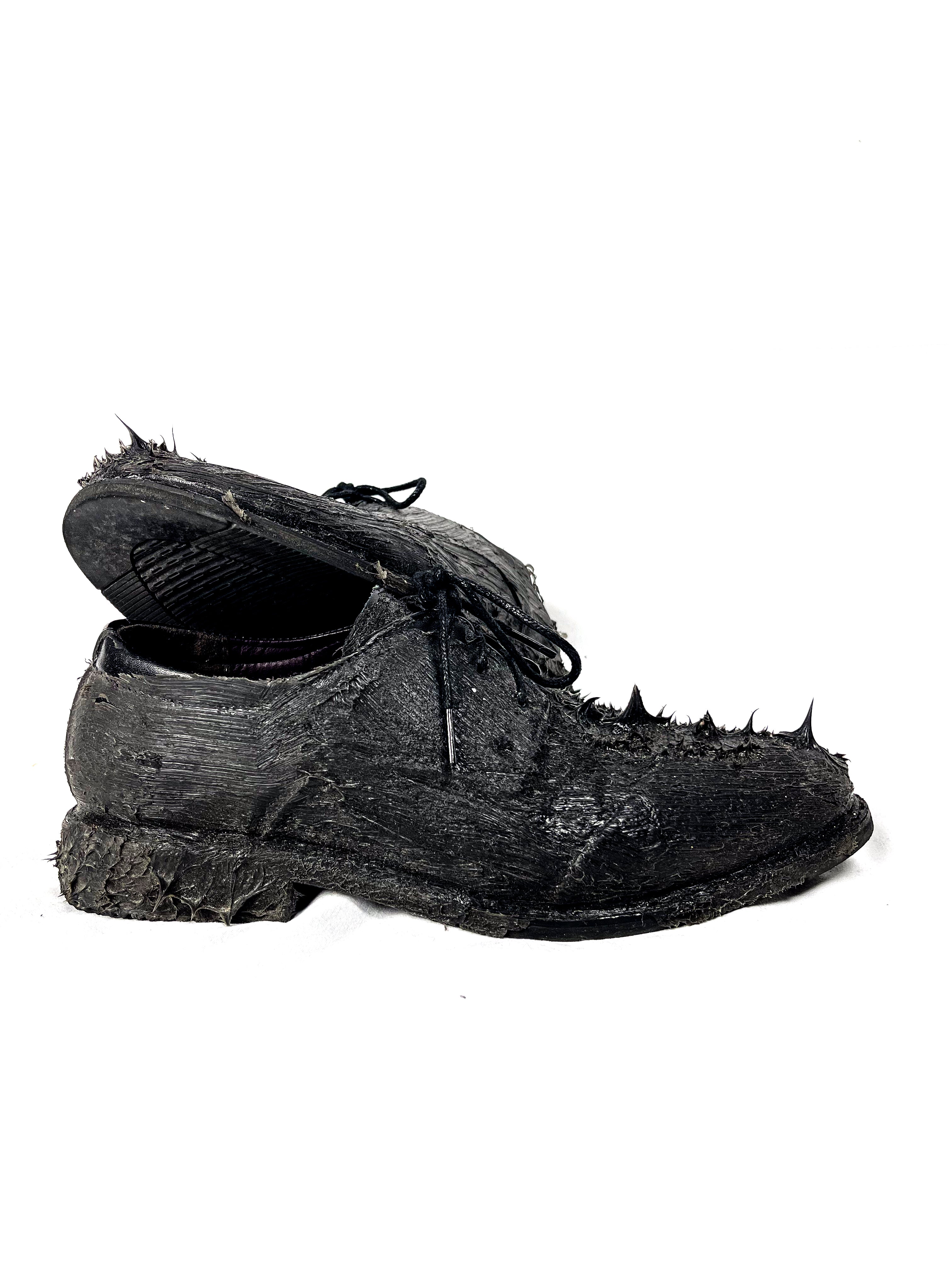 Inspired by a walk through the mud. These dress shoes are coated with a thick layer of silicone to replicate the look of mud and slime. Once again, elegance has been fused with chaos.